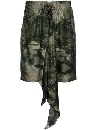 khaki silk satin finish camouflage print all-over Hawaii print scarf drawstring detailing elasticated drawstring waistband straight leg two side slit pockets rear welt pocket straight hem above-knee length
