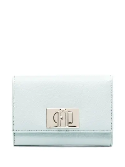 aqua blue calf leather grained texture tonal stitching tri-fold design gold-tone logo plaque to the front rear zip-fastening pocket note compartment eight internal card slots two internal slip pockets debossed internal logo gold-tone hardware twist-lock fastening to the front This piece comes complete with a protective dust bag.