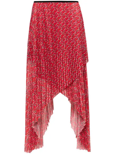 red satin finish all-over graphic print fully pleated draped design mid-rise elasticated waistband asymmetric hem mid-length unlined