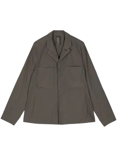 taupe brown cotton lightweight notched collar V-neck concealed front button fastening two chest patch pockets drop shoulder long sleeves straight hem