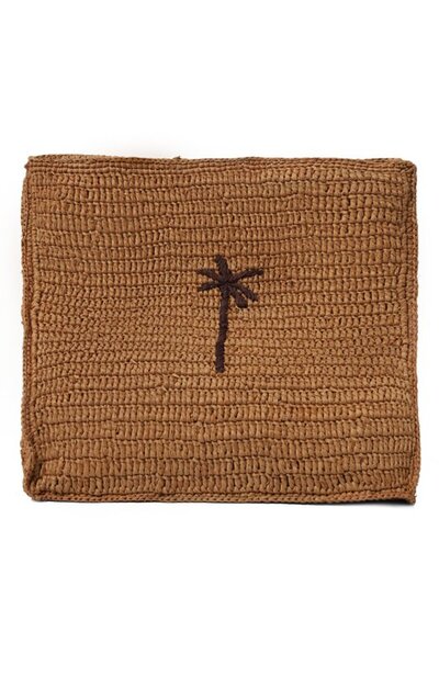 Светло-коричневую сумку Squared с двумя широкими ручками сплели вручную из прочной гибкой рафии. Изделие с фактурным узором украсили спереди изображением пальмы оттенка молочного шоколада. В аксессуар с небольшим внутренним карманом поместятся журнал формата А4, бутылка воды и смартфон.