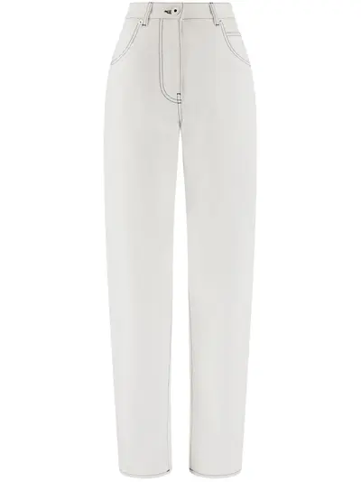 white cotton denim contrast stitching rivet detailing logo patch to the rear belt loops concealed fly and button fastening classic five pockets wide leg