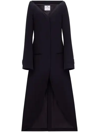 black crepe texture V-neck buttoned-cuff sleeves long sleeves two front welt pockets open front long length