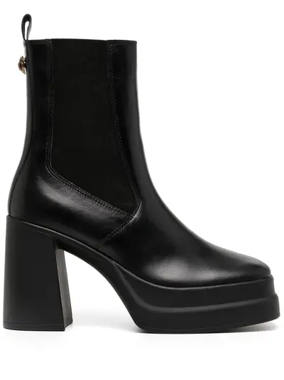 jet black calf leather ankle length pull-tab at the heel elasticated side panels round toe branded insole high block heel