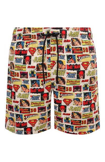 Для пошива плавок-шортов с красочным принтом, изображающим героев комиксов, использовали гладкий быстросохнущий текстиль из переработанного полиэстера. Модель с эргономичным сетчатым подкладом и широким эластичным поясом-кулиской дополнена двумя боковыми карманами и одним задним с застежкой велкро. Два люверса не позволяют изделию вздуваться в воде.