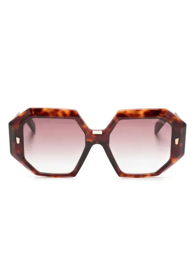 brown tortoiseshell effect acetate oversize frame UV-protective gradient lenses logo lens decal rivet detailing straight arms with curved tips These glasses come with a protective case.