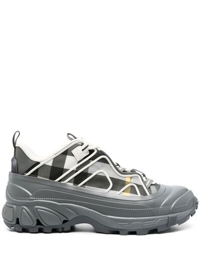 grey calf leather check print ridged rubber sole logo pull-tab at the heel front lace-up fastening panelled design round toe