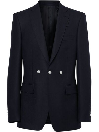 A quintessentially British brand, Burberry creates iconic designs that seamlessly infuse their rich heritage with a contemporary aesthetic. This navy blue wool and linen blend English Fit Triple Stud Wool Mohair Tailored Jacket from Burberry features structured shoulders, notched lapels, a broad welt chest pocket, long sleeves, three silver-tone logo-engraved studs to the front, front flap pockets and a double vent to the rear.
