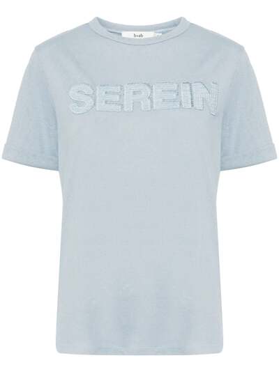 powder blue cotton blend jersey texture crew neck short sleeves patch detail straight hem