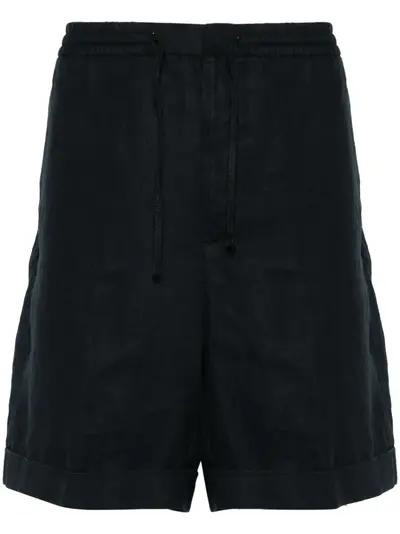 navy blue linen/flax slub texture elasticated drawstring waistband two side inset pockets turn-up hem two rear welt pockets concealed front button, hook and zip fastening