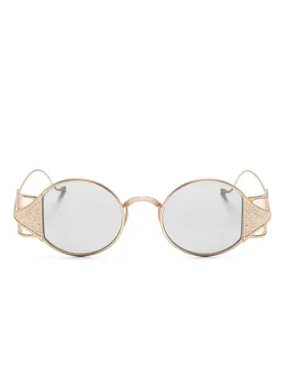 gold-tone stainless steel round frame grey tinted lenses UV-protective lenses nose pads sculpted arms curved tips