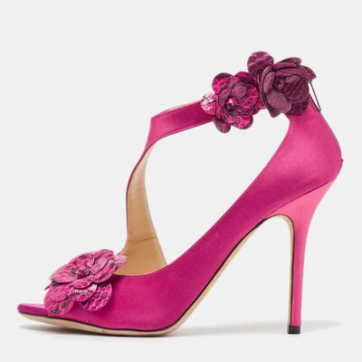 Embodying a pleasing pink shade, these sandals are the perfect choice for cocktail parties. Made from satin along with python leather and flaunts flowers on the vamps and ankle straps. Featuring rear zipper closures, the insoles are leather lined.