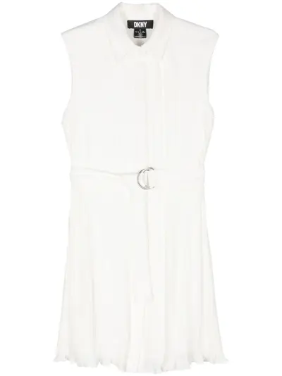 cream white panelled design classic collar sleeveless pleat detailing detachable waist belt full lining curved hem concealed front button fastening
