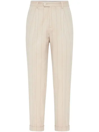 beige wool-cashmere blend vertical stripe pattern pleat detailing belt loops concealed fly and button fastening tapered leg two side inset pockets two rear welt pockets turn-up cuffs