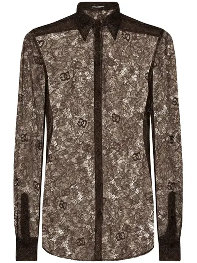 brown Chantilly lace all-over logo embroidery straight-point collar long sleeves buttoned cuffs concealed front button fastening curved hem