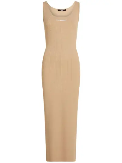 beige ribbed knit embroidered logo to the front round neck sleeveless logo waistband mid-calf length straight hem