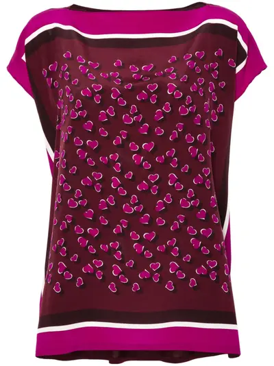 fuchsia pink/dark red silk crepe texture lightweight-jersey back panel hearts print stripe detailing solid border boat neck cap sleeves straight hem