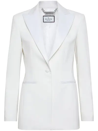 optical white slim cut peak lapels front button fastening long sleeves buttoned cuffs two front welt pockets straight hem full lining