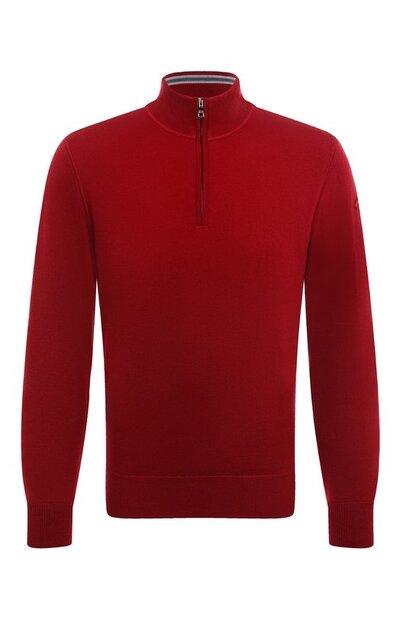 Свитер насыщенного красного цвета выполнили из тонкой шерсти первого пострига, волокна которой мягче, прочнее и эластичнее обычной. Изделие из нее поддерживает оптимальную терморегуляцию, не сковывает движения и приятно ощущается на коже, поэтому его комфортно носить даже на голое тело. Чтобы модель с высоким воротом было удобнее надевать и снимать, спереди предусмотрели короткую молнию.