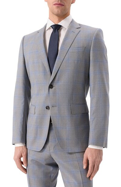 Серый костюм с крупным клетчатым узором, выполненным голубыми нитями, сшили из плотной мягкой шерсти, которая почти не мнется. Тщательно выверенный крой обеспечивает точную посадку брюк со стрелками и пиджака с тремя внешними и одним внутренним карманами. Модель найдет общий язык с вещами как из нестрогого, так и из офисного гардероба.
