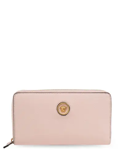 light pink calf leather grained texture Medusa Head motif logo stamp to the rear internal logo stamp rectangle shape top zip fastening partitioned compartment internal zip-fastening pocket internal card slots contrast lining