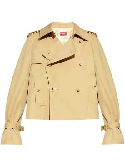 beige cotton blend gabardine weave double-breasted button fastening logo patch to the rear epaulettes cut-out sleeves long sleeves belted cuffs straight hem