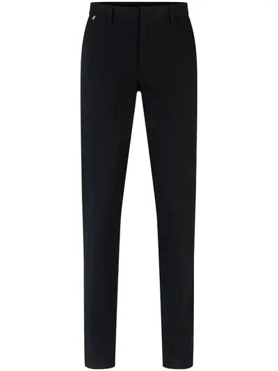 black cotton blend gabardine weave belt loops mini logo tag to the front two side slash pockets full-length logo patch to the rear two rear jetted pockets slim cut concealed front button, hook and zip fastening
