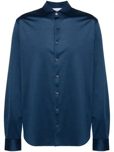 navy blue cotton classic collar front button fastening long sleeves buttoned cuffs curved hem
