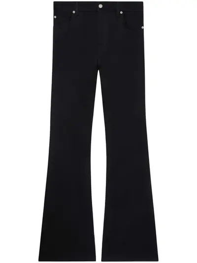 black cotton blend denim embroidered logo to the rear belt loops mid-rise bootcut front button and zip fastening classic five pockets