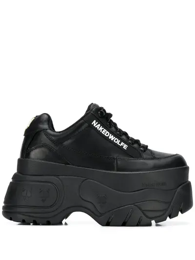 platform low top sneakers from NAKED WOLFE featuring black, leather, logo patch at the tongue, logo print to the side, embossed logo to the rear, embossed logo to the side, branded heel counter, round toe, front lace-up fastening, platform sole and chunky rubber sole.