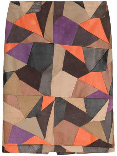 circa 2000s brown/multicolour leather suede panelling geometric-pattern print mid-rise rear zip fastening straight hem above-knee length full lining Condition: GOOD. This previously owned and used item is in good condition with minimal signs of use. This may include fading of material or plating and scratches.