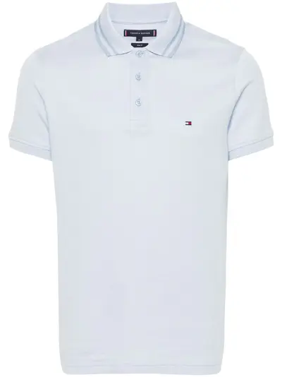 sky blue organic cotton stripe detailing embroidered logo at the chest polo collar short sleeves short side slits straight hem front button placket