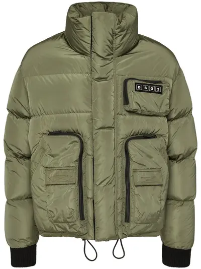 olive green padded design duck down logo patch at the chest high neck front zip fastening multiple zip-fastening pockets front toggle fastening long sleeves ribbed cuffs straight hem