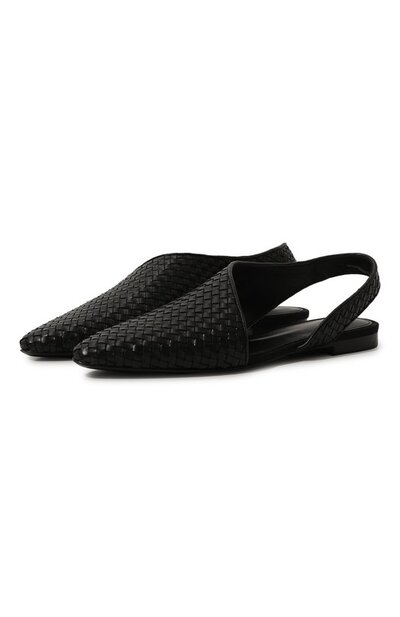 Черные балетки d'Orsay с зауженным мысом, невысоким устойчивым каблуком и открытой пяткой выполнили из мягкой телячьей кожи с гладкой матовой поверхностью. Узкие ленты этого материала искусно переплели вручную, получив геометричный узор. Такая модель впишется в комфортные повседневные образы любой палитры, сочетаясь и с шортами, и с юбкой, и с романтичным платьем.