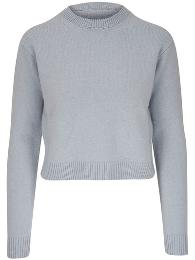 light blue cashmere knitted construction crew neck drop shoulder long sleeves ribbed trim straight hem