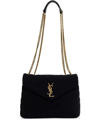 Sea blue quilted finish signature YSL logo plaque two chain-link shoulder straps single flat top handle foldover top with press-stud fastening partitioned compartment internal zip compartment internal slip pocket full lining gold-tone hardware