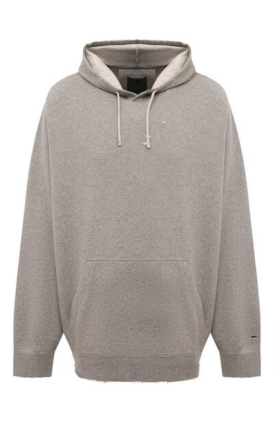 Меланжево-серому худи силуэта oversize придали нарочито небрежный вид с помощью декоративных разрывов и потертостей. Для изготовления модели с регулируемым капюшоном и карманом «кенгуру» использовали мягкий хлопковый трикотаж, который поддерживает комфортный микроклимат. На принадлежность марке деликатно указывают небольшие логотип и эмблема 4G, вышитые розовыми нитями.