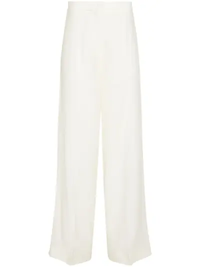 off-white virgin wool-silk blend organza wide leg mid-rise concealed front button, hook and zip fastening two side slit pockets two rear welt pockets pressed crease full lining straight hem