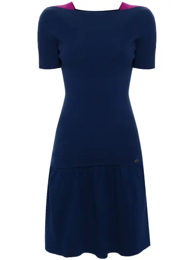circa 2000s navy blue/plum purple wool-cashmere blend ribbed knit square neck short sleeves straight hem above-knee length Condition: GOOD. This previously owned and used item is in good condition with minimal signs of use. This may include fading of material or plating and scratches.