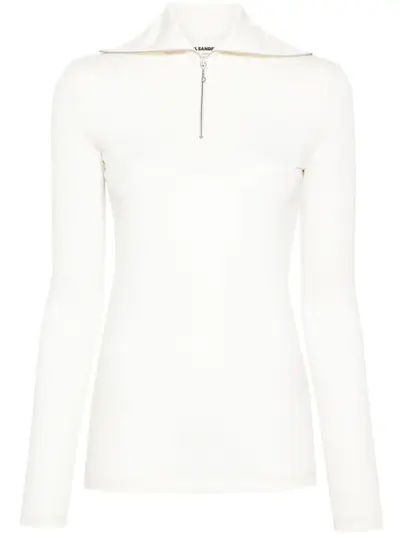 cream white jersey texture logo print at the neckline seam detailing long sleeves straight hem short front zip fastening