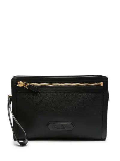 black leather pebbled texture front zip-fastening pocket embossed logo to the front detachable wrist strap main compartment internal logo stamp gold-tone hardware top zip fastening