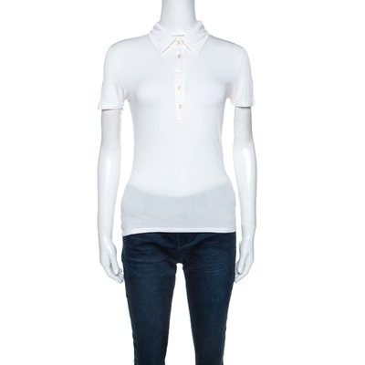 This Max Mara T shirt speaks style through its simple design Made from cotton elastane blend, it is fashioned with short sleeves, a simple collar and front buttons. You may style this comfortable T shirt with bottoms of your choice.