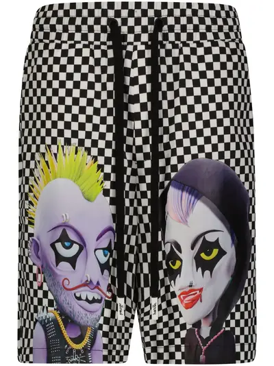 black/white cotton check pattern graphic print to the front elasticated drawstring waistband two side inset pockets two rear welt pockets
