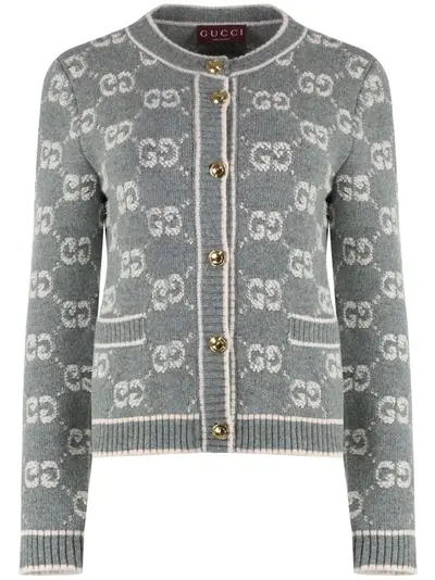 grey/cream white wool bouclé construction signature GG Damier jacquard embossed gold-tone buttons crew neck front button fastening long sleeves two front patch pockets ribbed edge