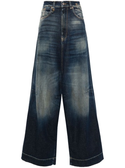 indigo blue cotton blend denim dart detailing whiskering effect at the thighs logo patch to the rear low-rise belt loops concealed fly and button fastening drop crotch wide leg