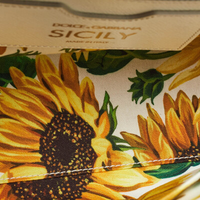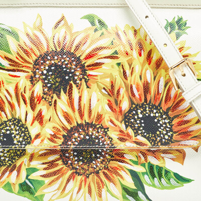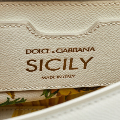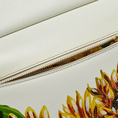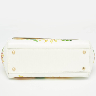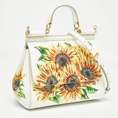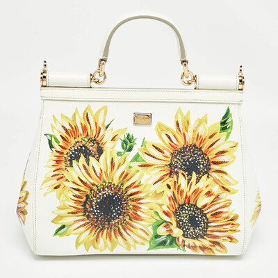 Dolce and Gabbanas Miss Sicily has been seen in numerous versions, each high in appeal and perfect in construction. This version is sewn using white leather and the iconic top handle silhouette is beautified with sunflowers on the front and back. This ones an accessory for all seasons.