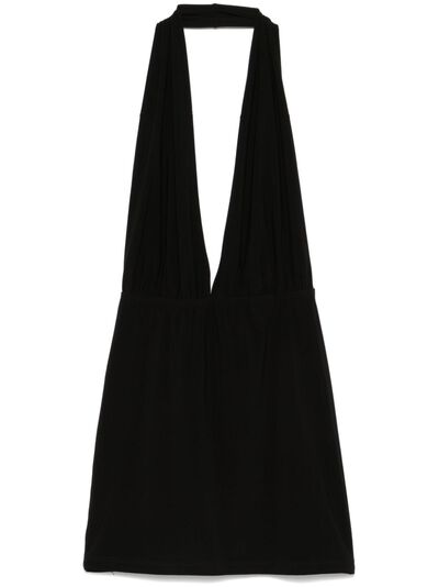black jersey texture halterneck plunging V-neck sleeveless fitted waistline open back elasticated trim unlined straight hem thigh-length