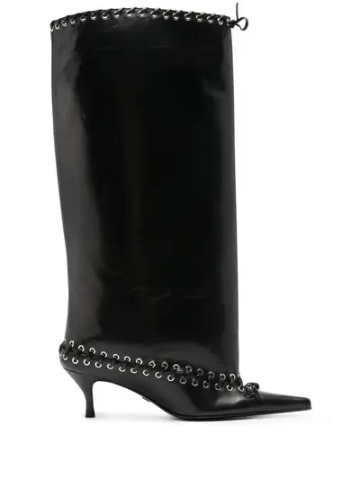 black calf leather pointed toe bow detailing metal eyelet detailing mid-calf length branded leather insole leather lining 70mm mid sculpted heel leather sole silver-tone hardware slip-on style