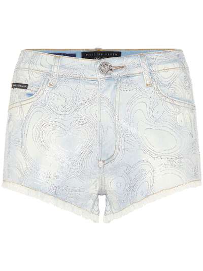 light blue cotton blend stretch-design frayed edge abstract pattern print mini logo tag logo patch to the rear belt loops front button fastening classic five pockets thigh-length