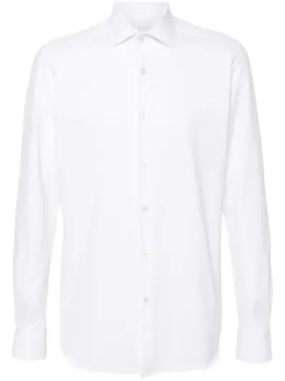 white stretch-design poplin texture spread collar front button fastening long sleeves buttoned cuffs curved hem